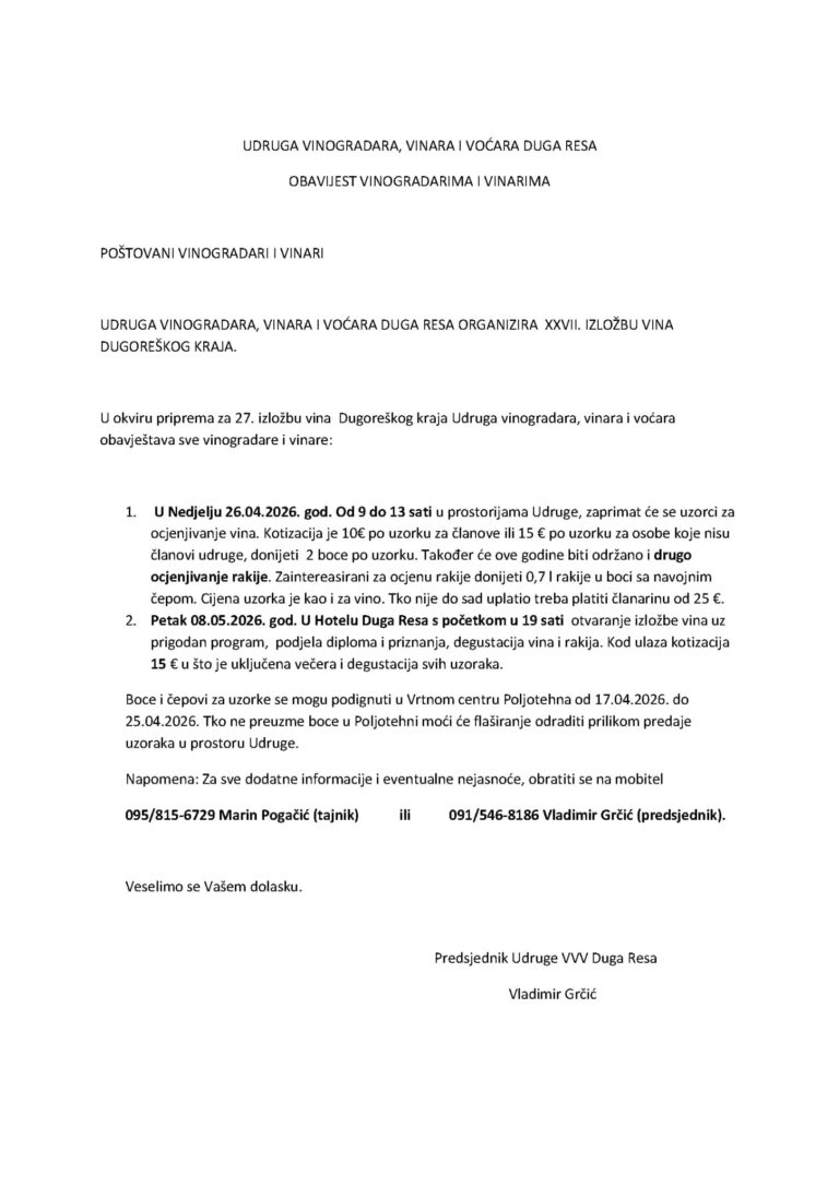 Udruga vinogradara, vinara i voćara Grada Duge Rese, osnovana je 1997. godine sa ciljem razvoja vinogradarstva, vinarstva i voćarstva na području Grada Duge Rese i šire okolice.